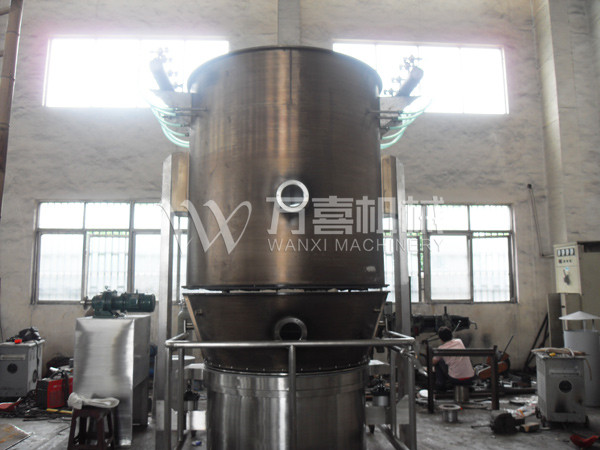 空气经加热净化后,由引风机从下部导入,穿过料斗的孔网板。在工作室内,经搅拌和负压作用形成流态化,水份快速蒸发后随着排气带走,物料快速干燥。