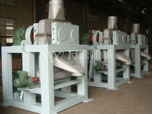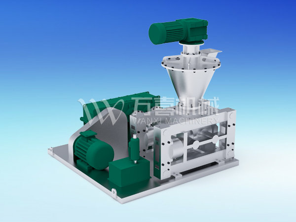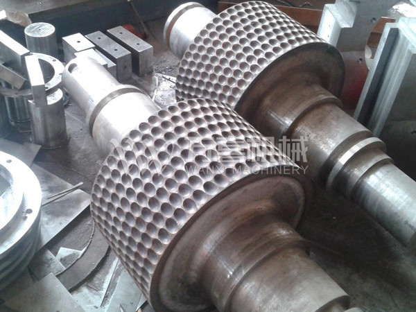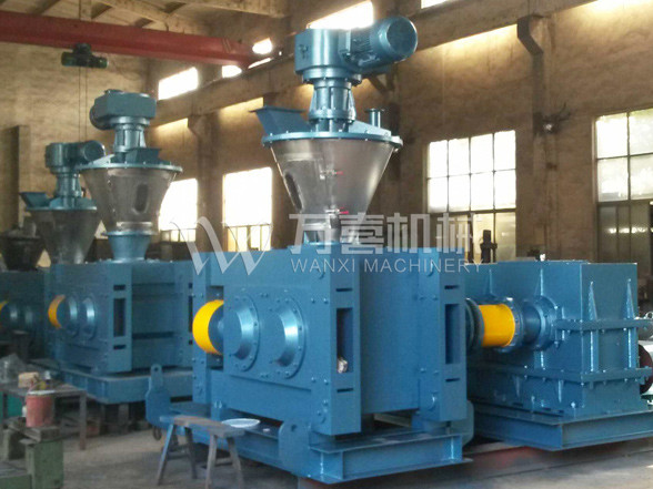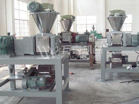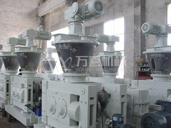 挤压造粒的形式可以有对辊式和轮辗式两种,对辊式挤压是先压成大块,再破碎成颗粒,这样装置的能力大、颗粒强度高、能耗低,对辊挤压在国外使用广泛。轮辗式是在辊表面直接做成有穴槽型的形状,一次挤成成型颗粒。产品强度较低有时需添加粘结剂。适合做有机肥和复合肥等颗粒肥料。