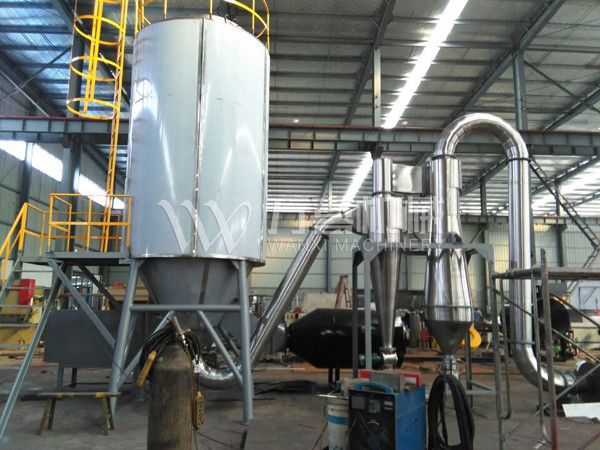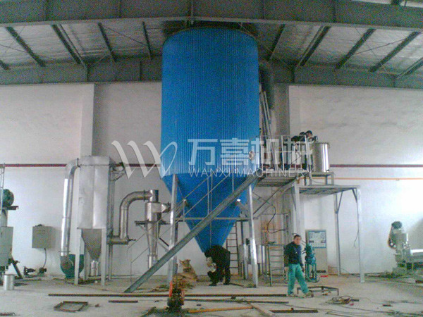 本机组工作过程为料液通过隔膜泵高压输入,喷出雾状液滴,然后同热空气并流下降,大部分粉粒由塔底排料口收集,废气及其微小粉末经旋风分离器分离,废气由抽风机排出,粉末由设在旋风分离器下端的授粉筒收集,风机出口还可装备二级除尘装置,回收率在96-98%以上。